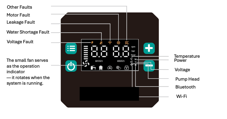 | Anti-Freeze Protection | When the internal water temperature of the pump is below 3°C and the pump has not operated for a while, the system enters anti-freeze protection mode. The motor will intermittently run for 5 minutes (or a user-set duration) to prevent freezing. During this process, the “Low-Water” indicator light will flash. |
